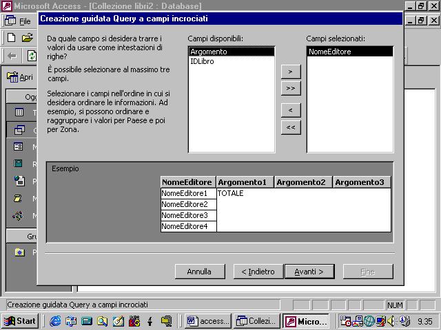 supponiamo di voler creare una tabella dalla quale possiamo ricavare il numero di libri che, per ogni editore, sono stati acquistati ogni anno. Come intestazione di riga dobbiamo scegliere allora il campo NomeEditore