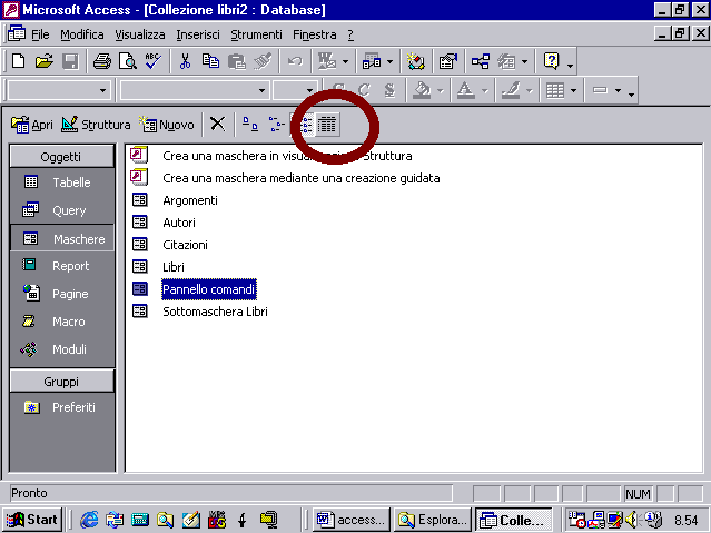 Per selezionare le varie categorie di oggetti possiamo operare sui pulsanti che appaiono alla sinistra nella finestra del database